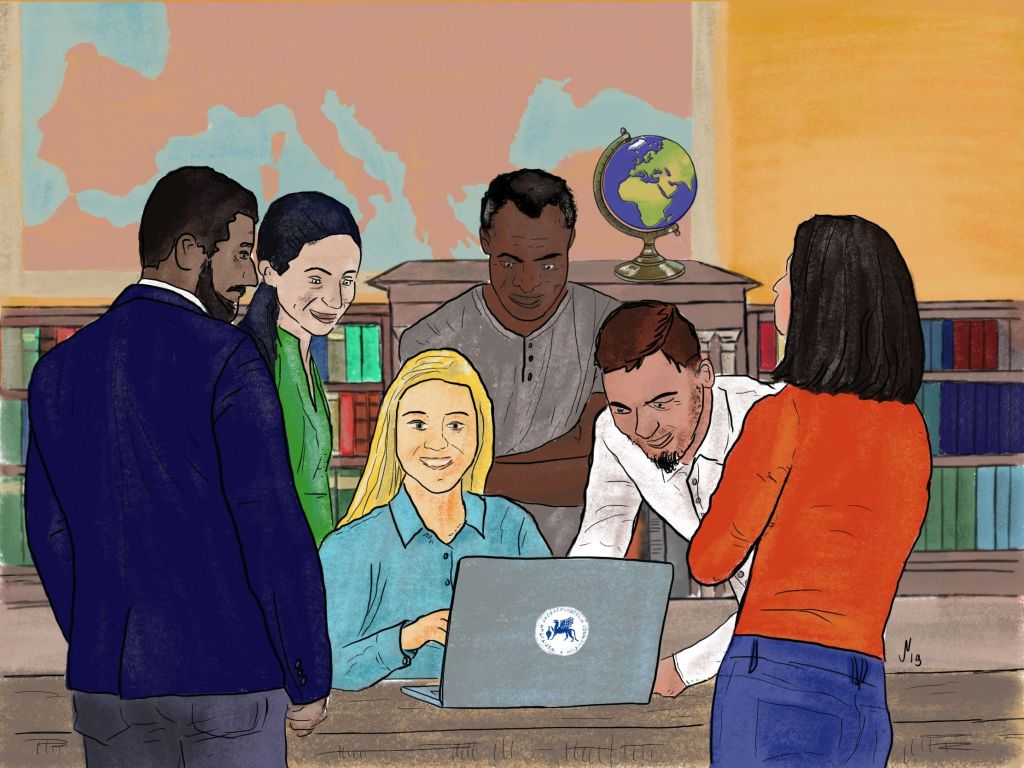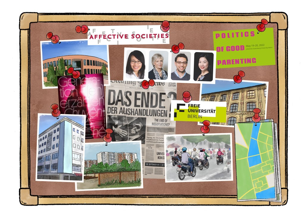 Illustrationen für ein Scrollytelling-Projekt zur Biographie des Sonderforschungsbereichs „Affective Societies – Dynamiken des Zusammenlebens in bewegten Welten“ an der Freien Universität Berlin.