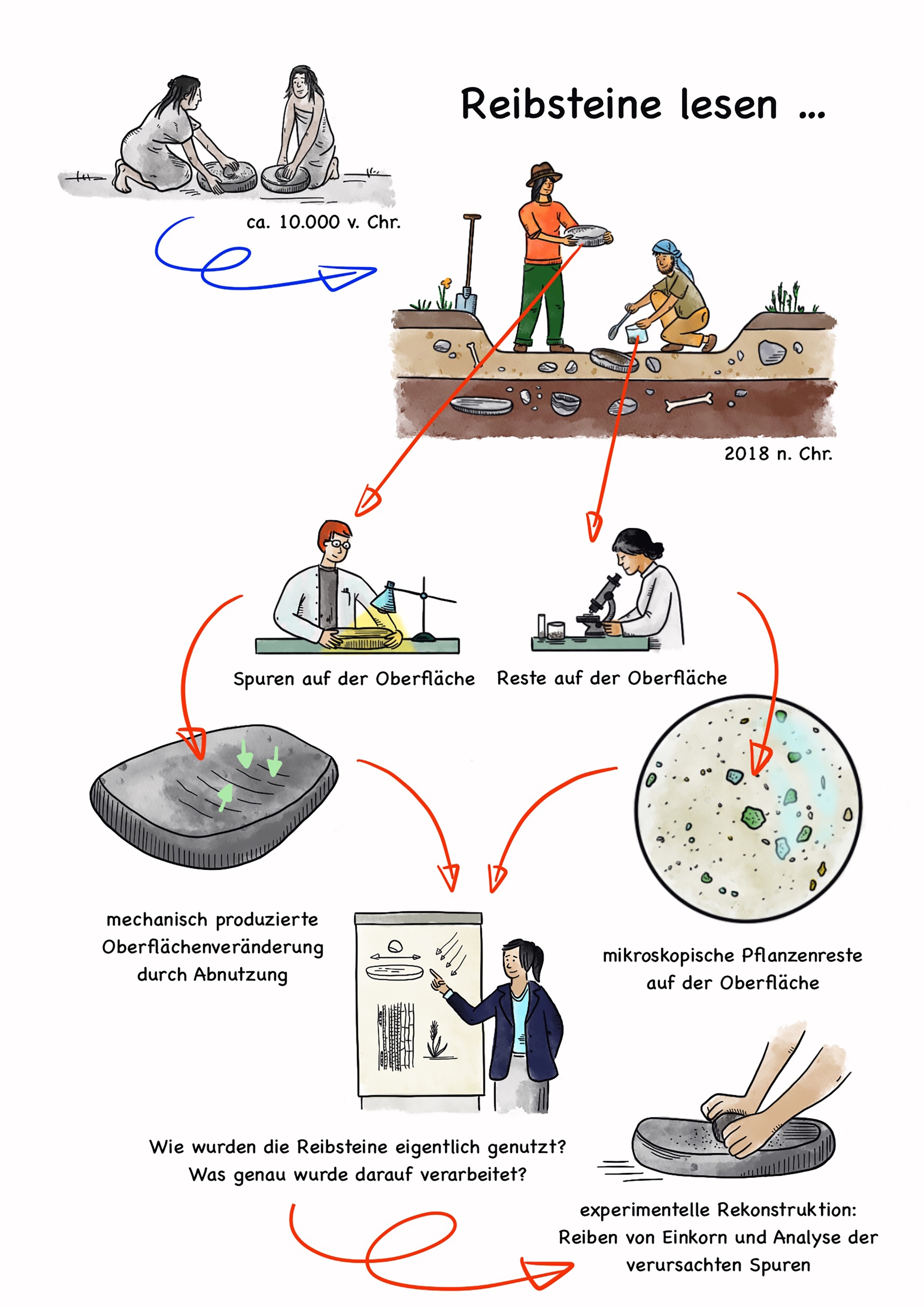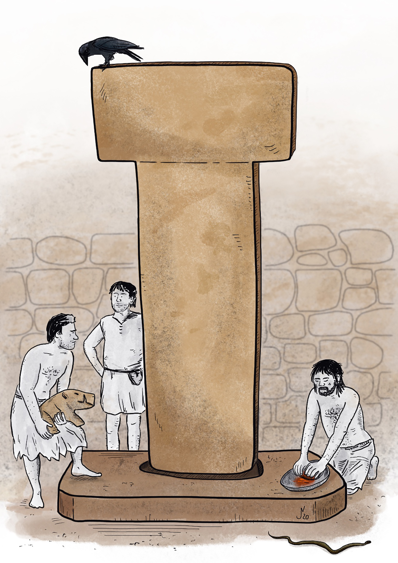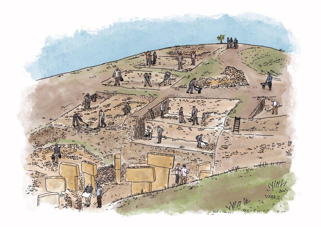 Illustrationen zur Verarbeitung von Nahrung auf den Dächern des frühneolithischen Göbekli Tepe (Türkei) und von Rötel-Farbpigmenten im Kontext ritueller Aktivitäten vor Ort für L. Dietrich, Plant Food Processing Tools at Early Neolithic Göbekli Tepe, Summertown: Archaeopress 2021.