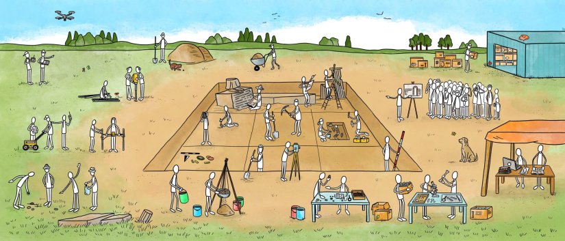 „Wimmelbild“ für den Webauftritt des Deutschen Archäologischen Instituts, das die vielfältigen Aktivitäten und Methoden einer archäologischen Ausgrabung illustriert.