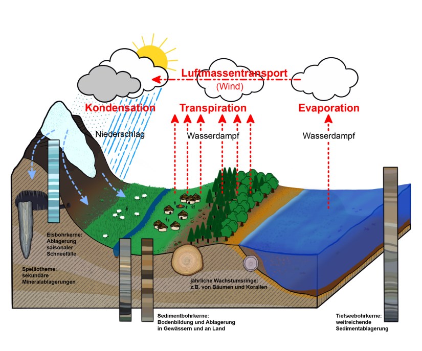 Infografik zum Wasserkreislauf und der Anreicherung stabiler Sauerstoffisotope in Eis, Sedimenten, Mineralablagerungen, Fossilien und Pflanzen, die als Klimaarchive ausgewertet werden können für die Sonderausgabe 2021 zur Klimaforschung des „Archäologie Weltweit“-Magazins des Deutschen Archäologischen Instituts.