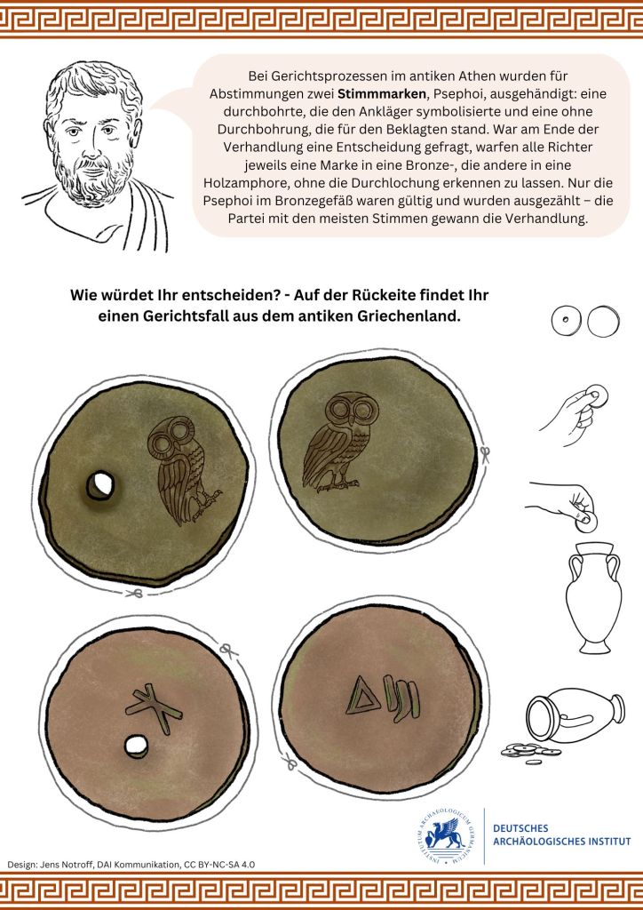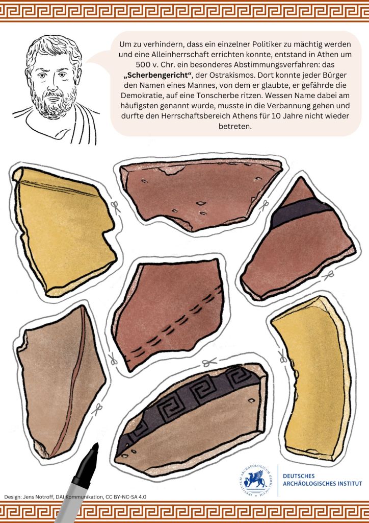 Illustrationen und Design für zwei Bastel- und Informationsbögen zur antiken griechischen Demokratie für das Deutsche Archäologische Institut anläßlich des Demokratiefests zur Feier des 75. Jahrestages des Deutschen Grundgesetzes.