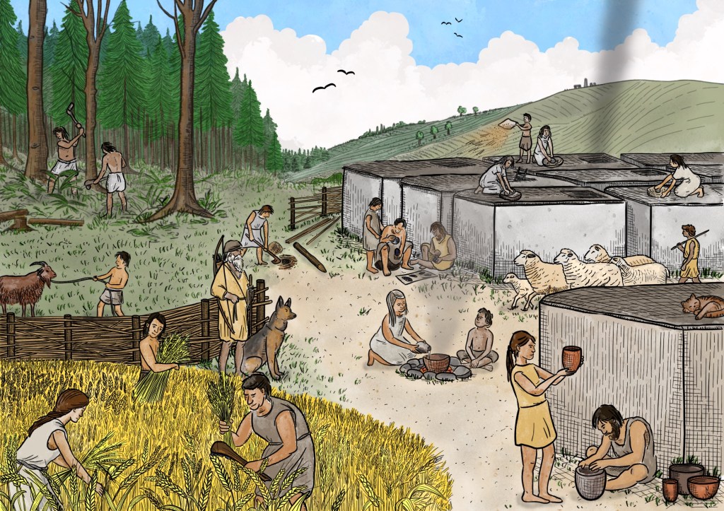 Visualisierung des „Neolithischen Pakets“, einer umfassenden Reihe von Innovationen und Entwicklungen, die zur sesshaften, nahrungsmittelproduzierenden Lebensweise führten, für Dr. Laura Dietrich (Martin-Luther-Universität Halle-Wittenberg / Österreichisches Archäologisches Institut).
